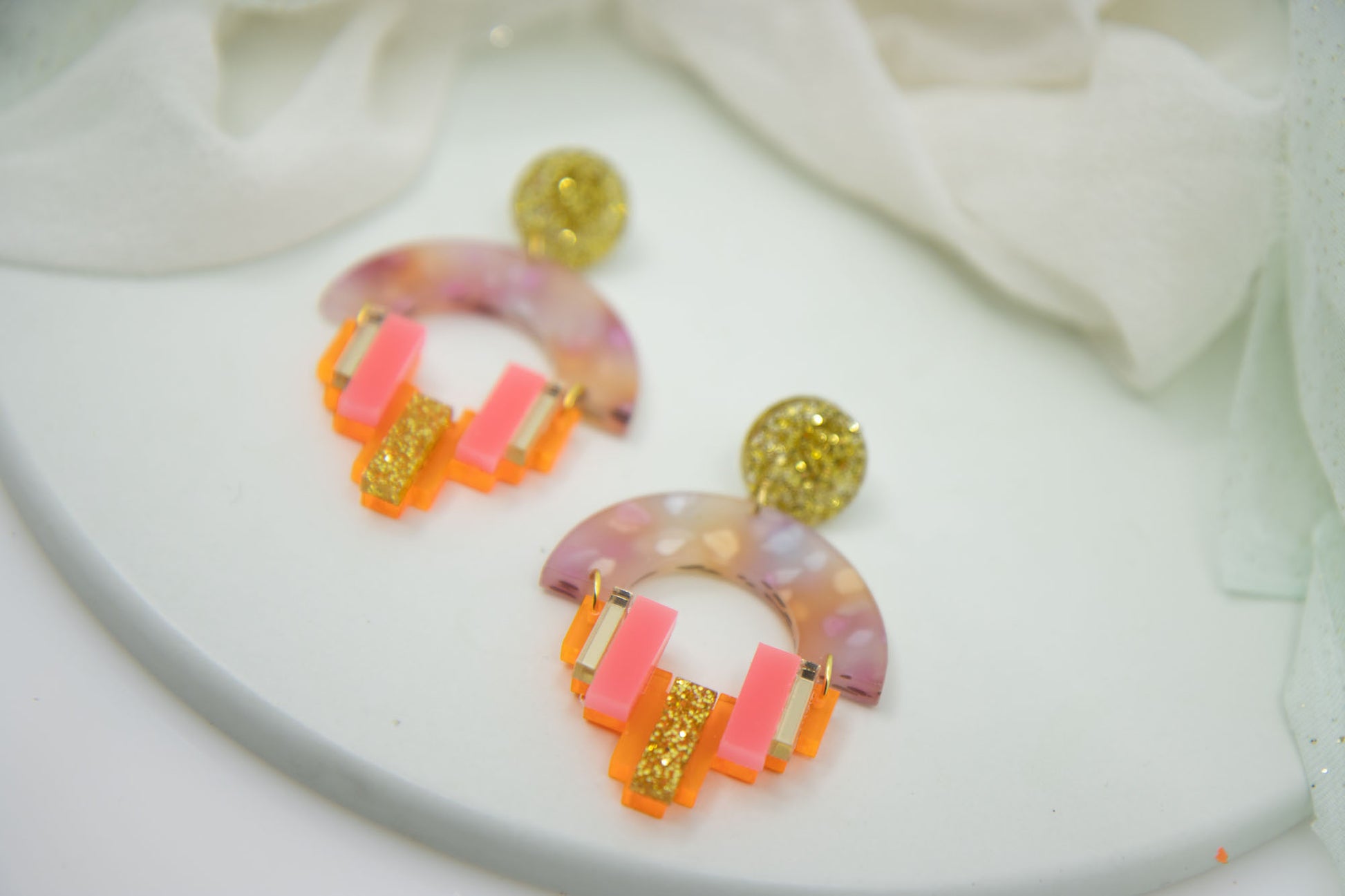 A pair of “NENA” earrings made of acrylic glass – designed with a flat surface and made with precision.