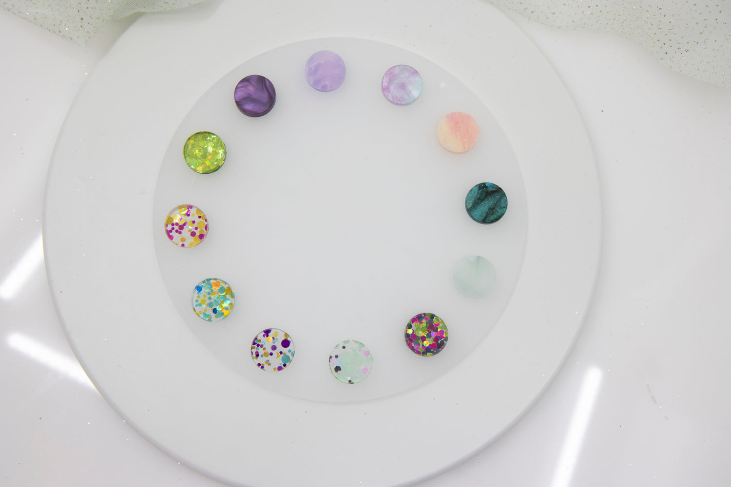 Diese Acrylplatten kommen in pastelligen und gedeckten Farben, mit zwei Oberflächenoptionen: eine glänzende und eine matte Seite. Welche Seite bei deinem Ohrring sichtbar ist, entscheide ich je nach den anderen verwendeten Materialien, um gezielt Kontraste zu setzen. Besonders matte Oberflächen wirken hervorragend in Kombination mit glitzernden oder spiegelnden Elementen.