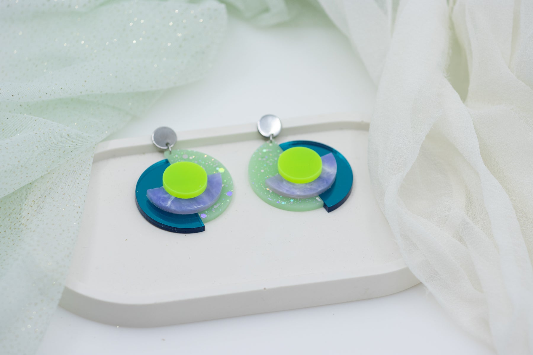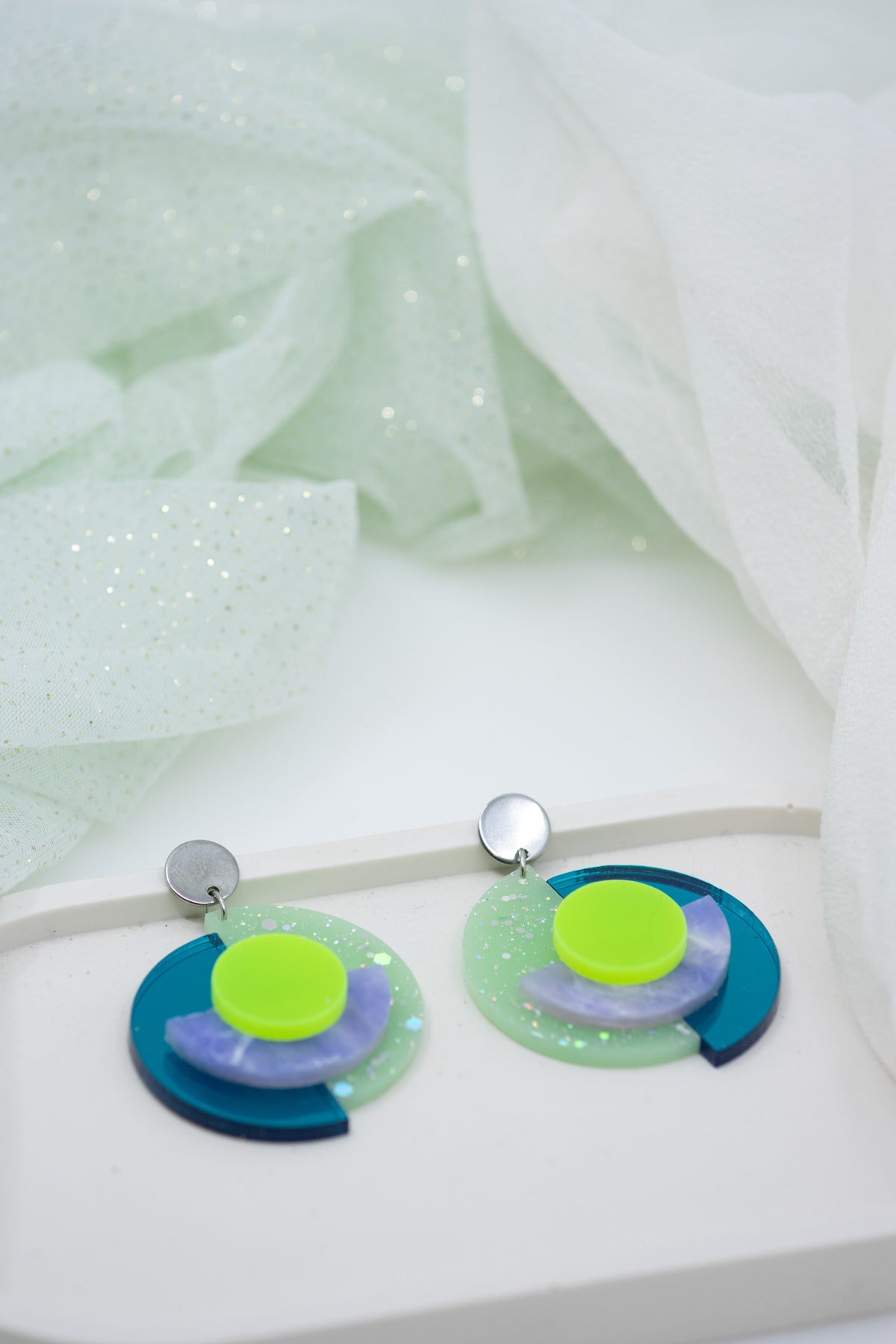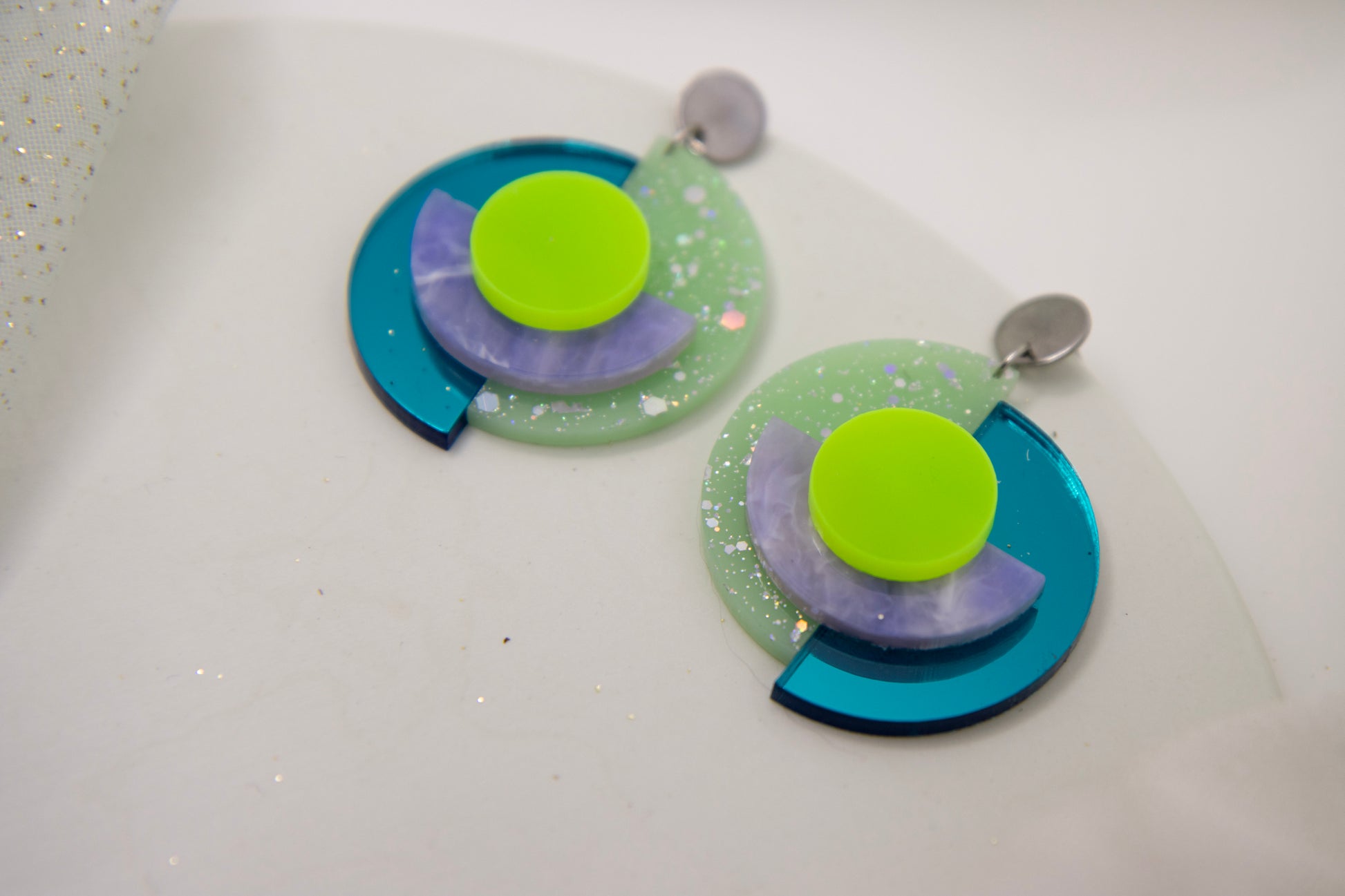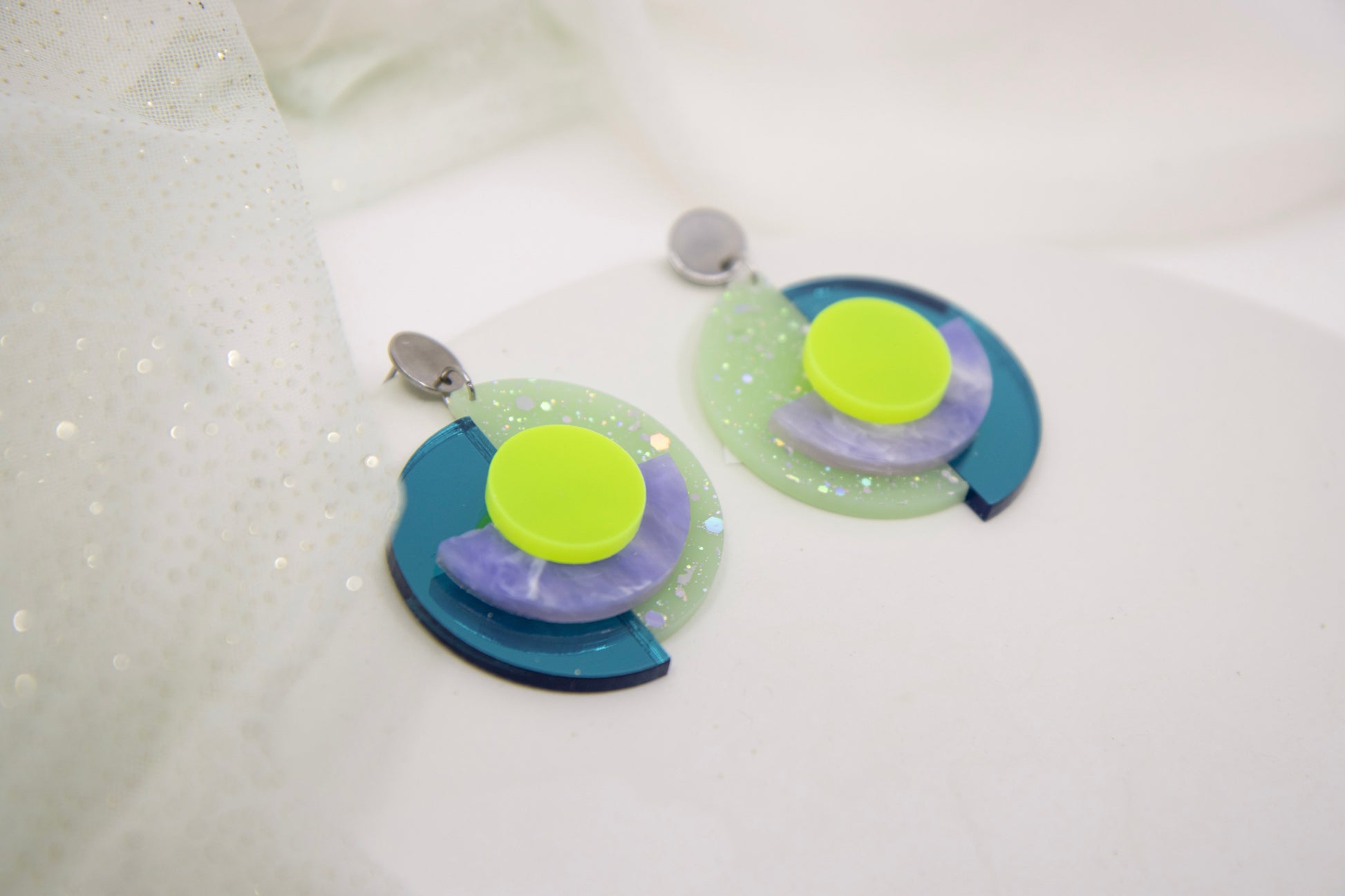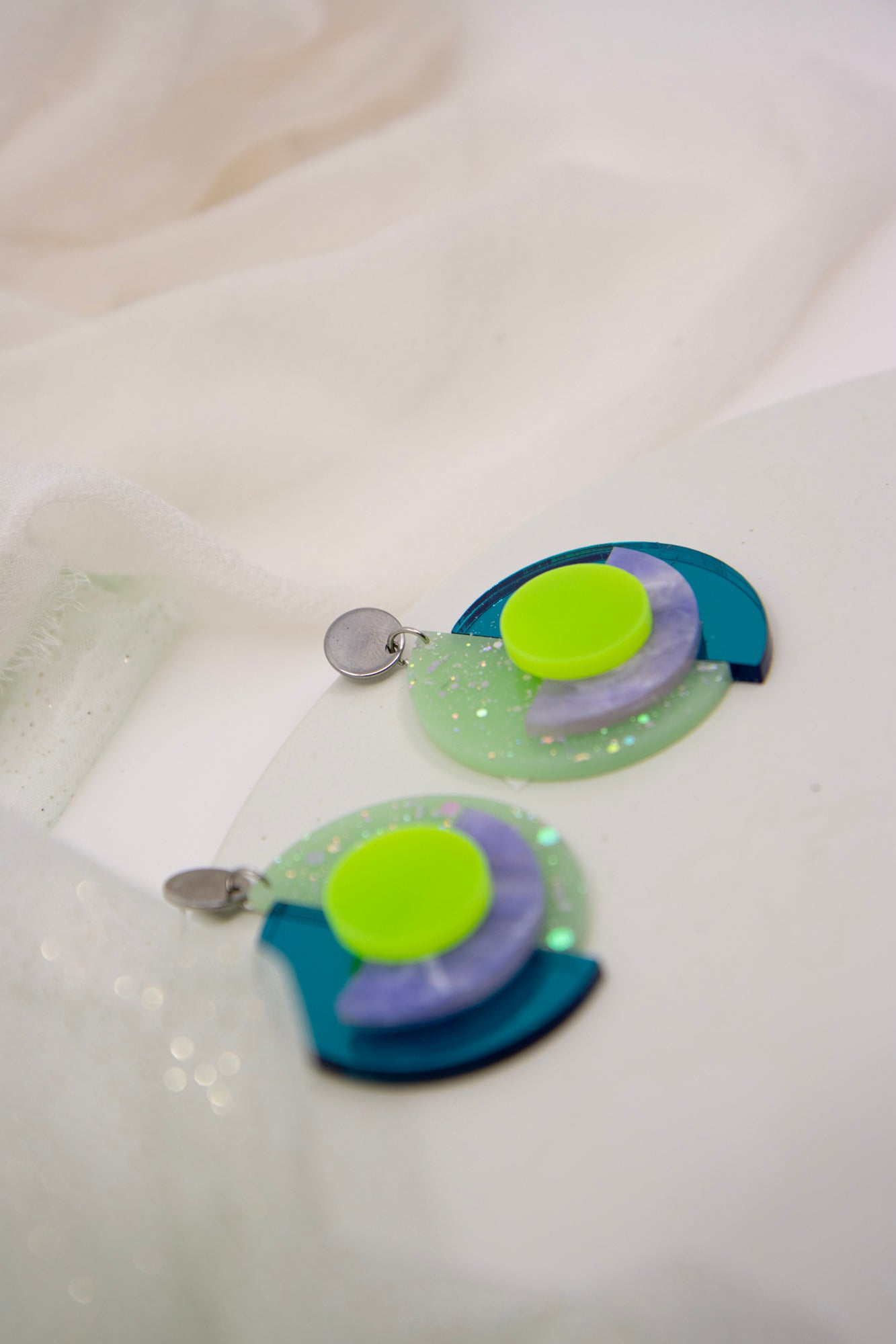 Strahlkraft trifft Struktur. RENA ELECTRIC ist ein Farbstatement in fluoreszierendem Neongrün, kombiniert mit tiefem Petrol, marmoriertem Lavendel und glitzerndem Mint. Die transluzenten Schichten erzeugen Tiefe und Leuchtkraft – besonders im Licht entwickelt der OhrStecker seine volle Wirkung.