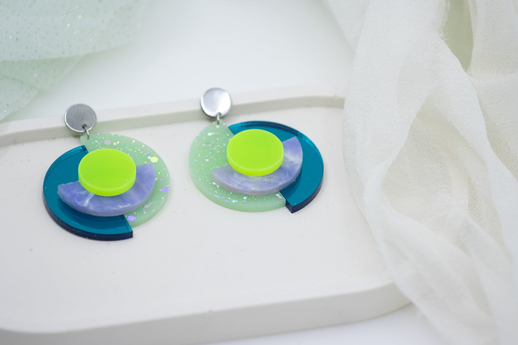 Gefertigt aus recyceltem Acrylglas, per CO₂-Laser geschnitten und in Handarbeit montiert. Die silberfarbenen Edelstahl-OhrStecker sind nickelfrei und angenehm zu tragen – auch für empfindliche Haut.