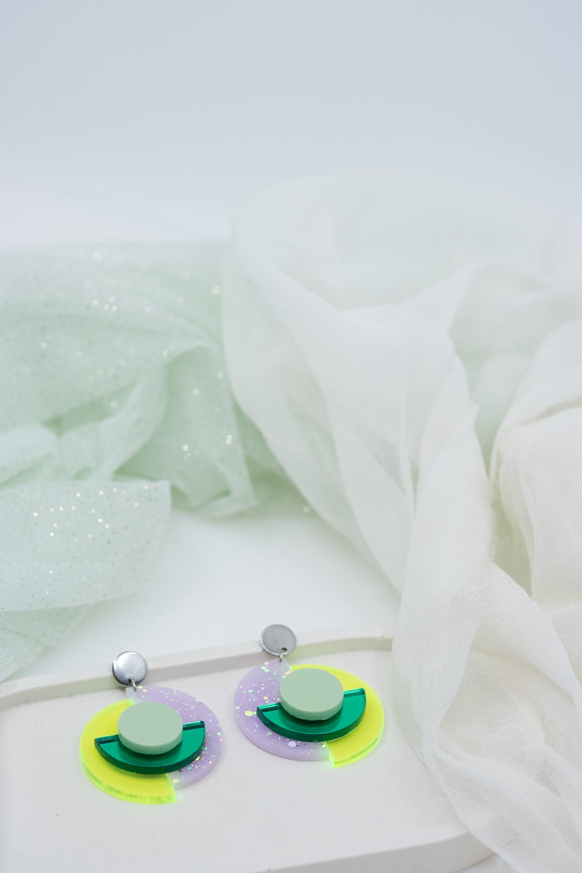 Gefertigt aus recyceltem Acrylglas, per CO₂-Laser geschnitten und in Handarbeit montiert. Die silberfarbenen Edelstahl-OhrStecker sind nickelfrei und angenehm zu tragen – auch für empfindliche Haut.