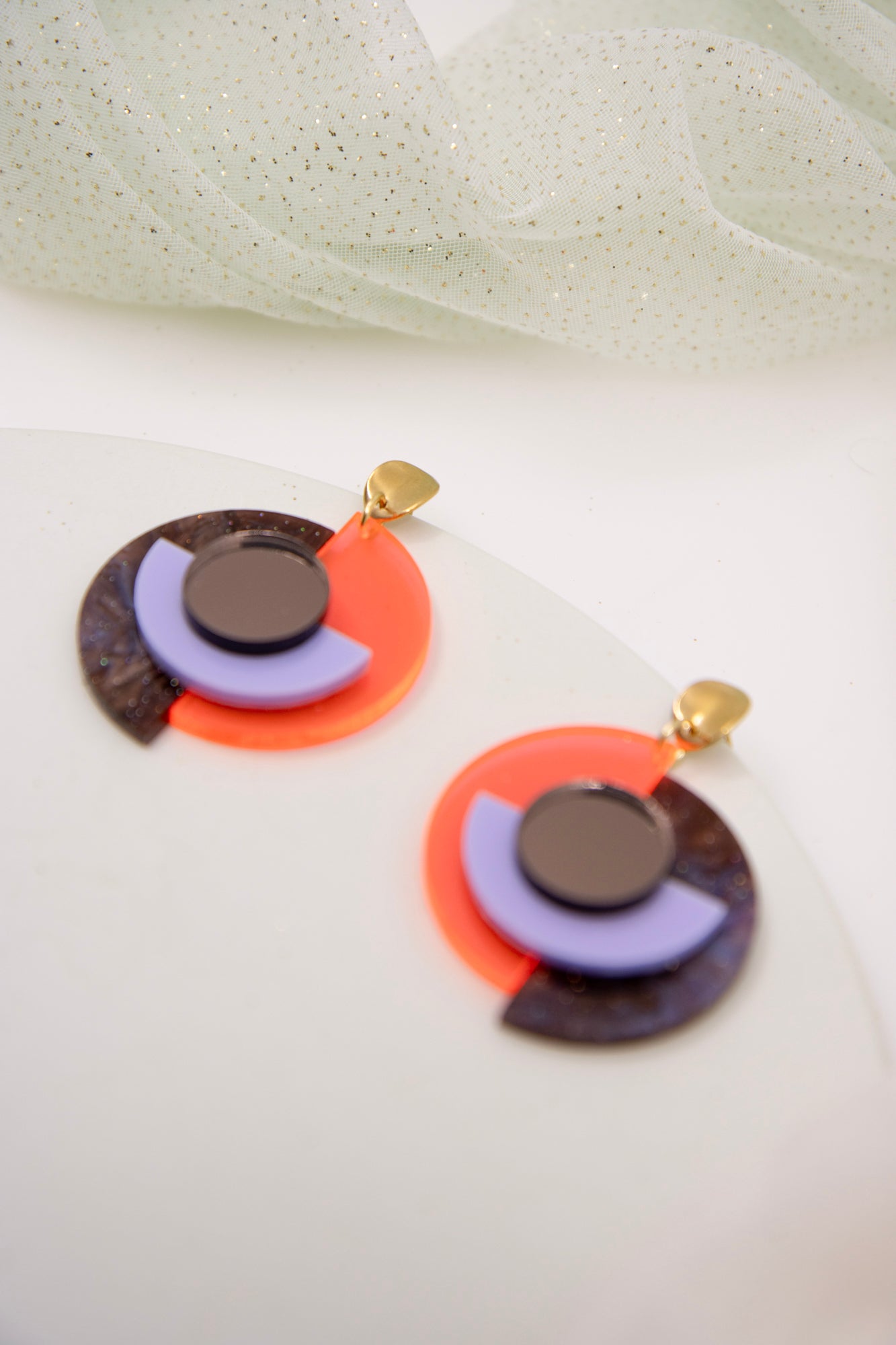 Kontrast in seiner klarsten Form. Das Modell RENA ORANGE kombiniert sattes Neonrot mit ruhigem Lavendel, spiegelndem Bronze und einer changierenden Marmorstruktur in Chocolate Berry Space. Ein grafisches Ensemble aus Halbkreisen und Vollformen, das laut denkt, ohne laut zu sein.