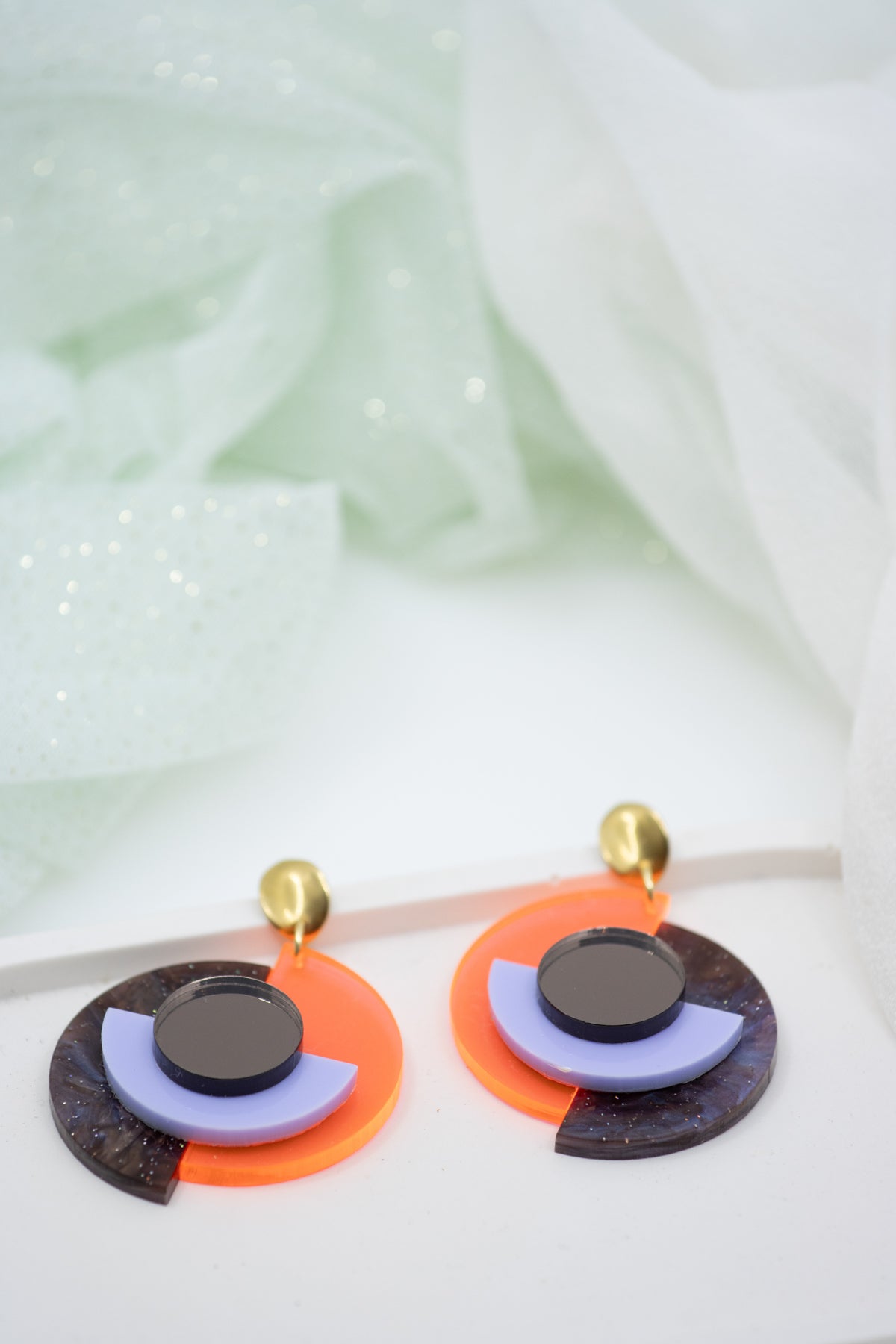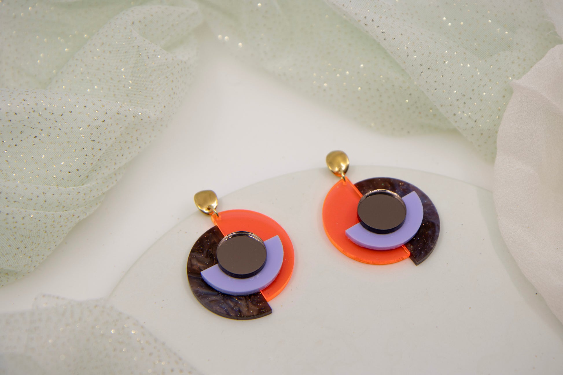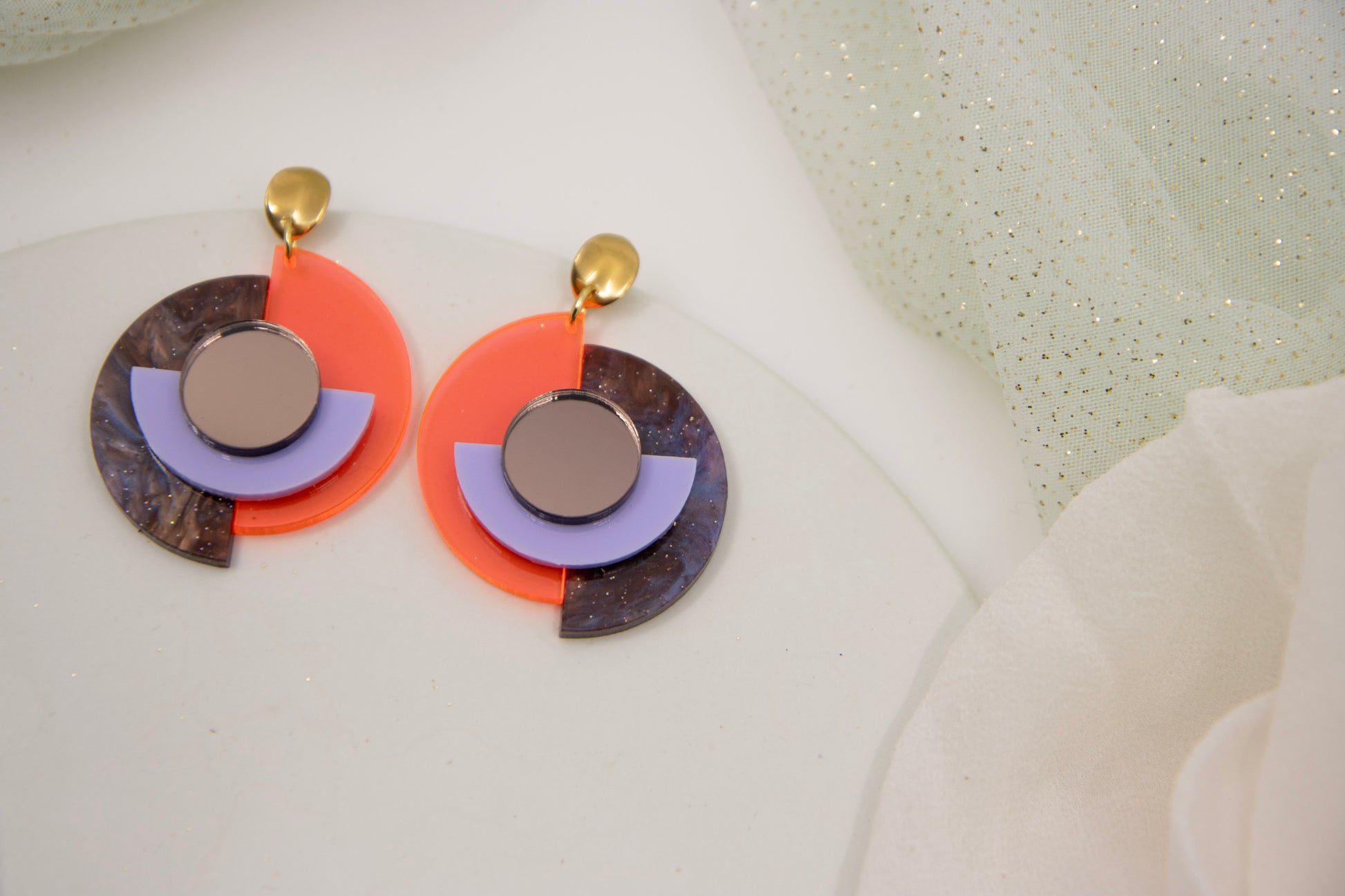 Gefertigt aus recyceltem Acrylglas, per CO₂-Laser geschnitten und in Handarbeit montiert. Die goldfarbenen Edelstahl-OhrStecker sind nickelfrei und angenehm zu tragen – auch für empfindliche Haut.