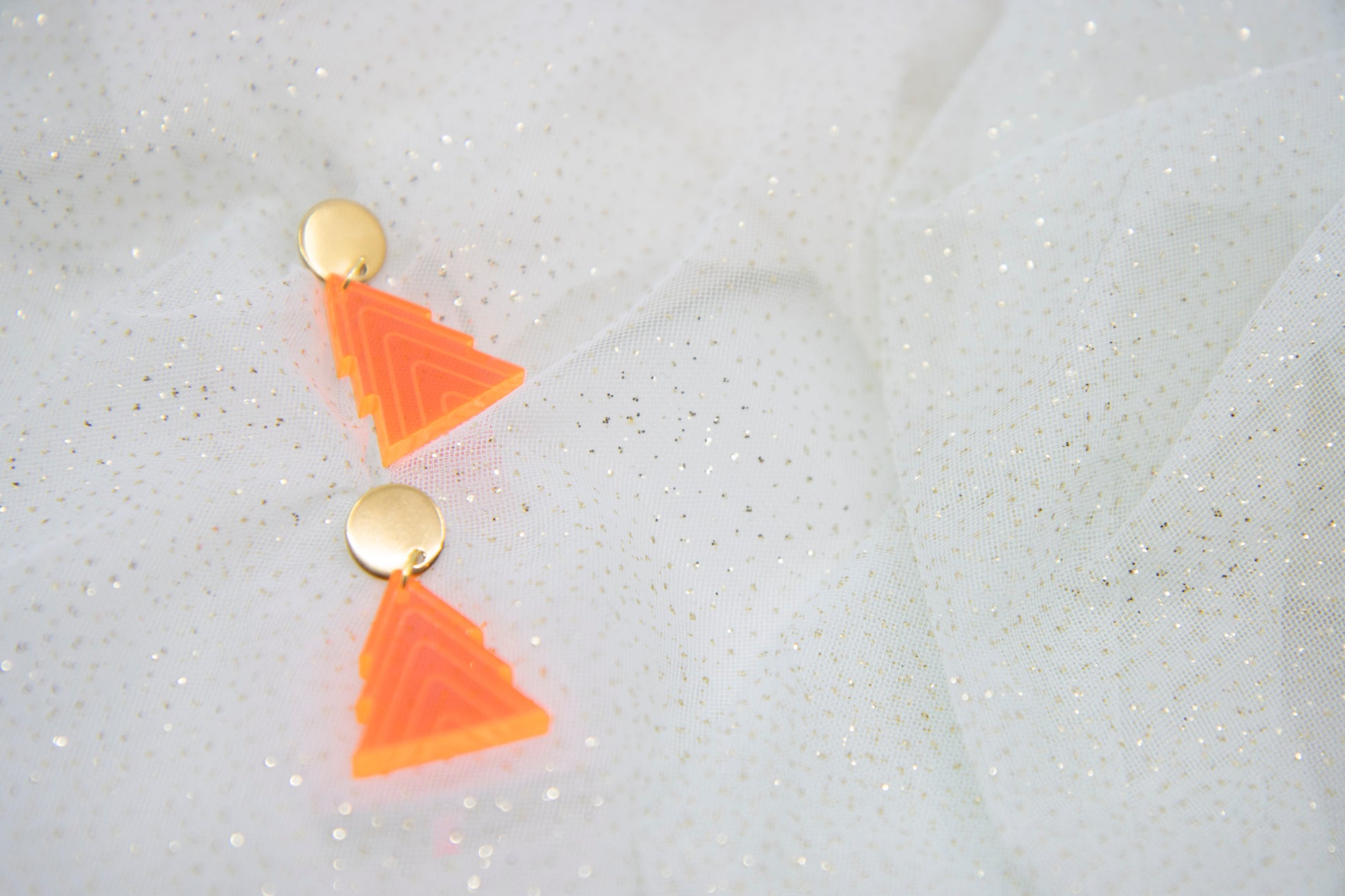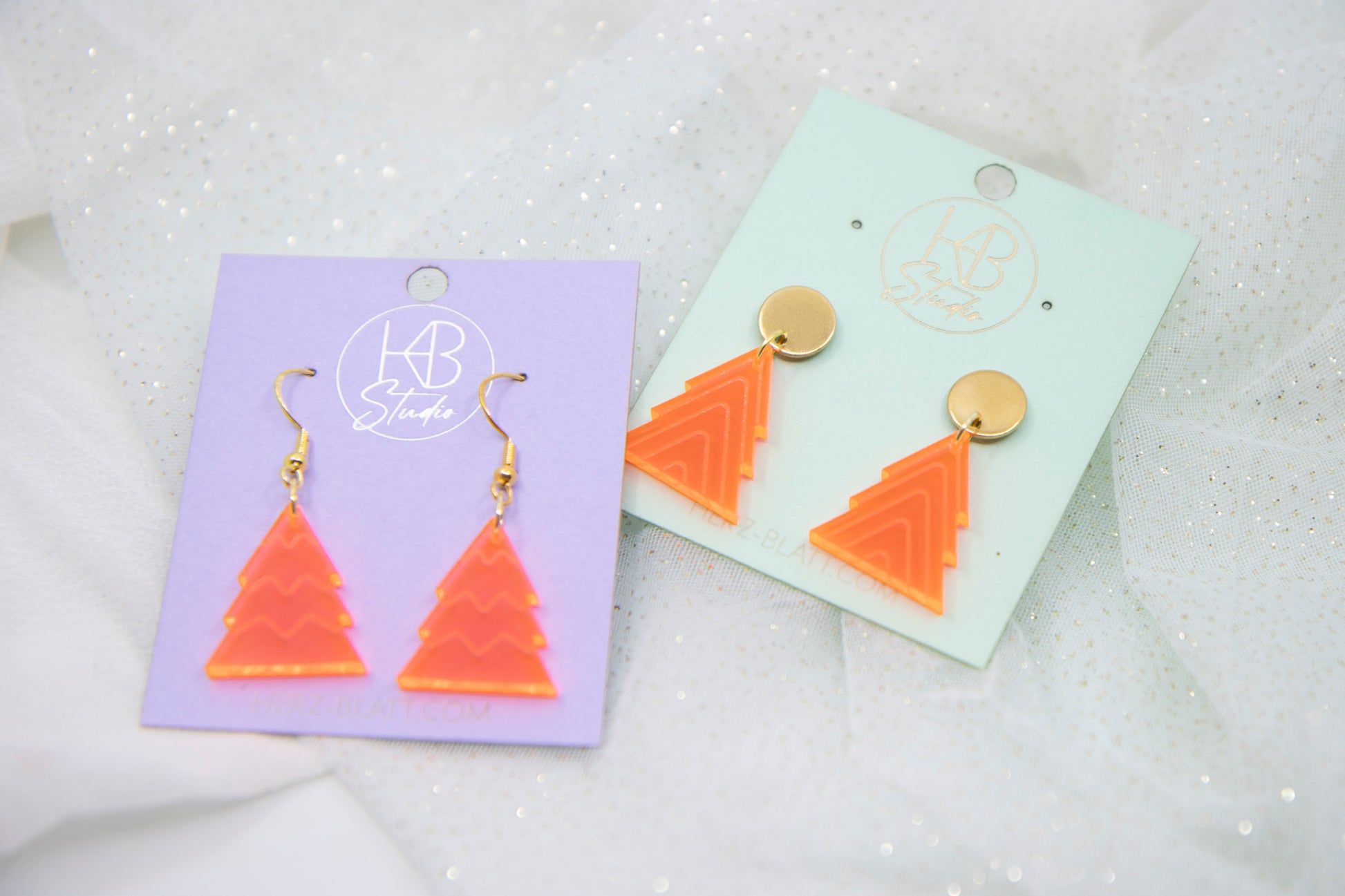 Ein Paar Weihnachtsbaum-Ohrringe aus Acrylglas – flächig gedacht, präzise gemacht.