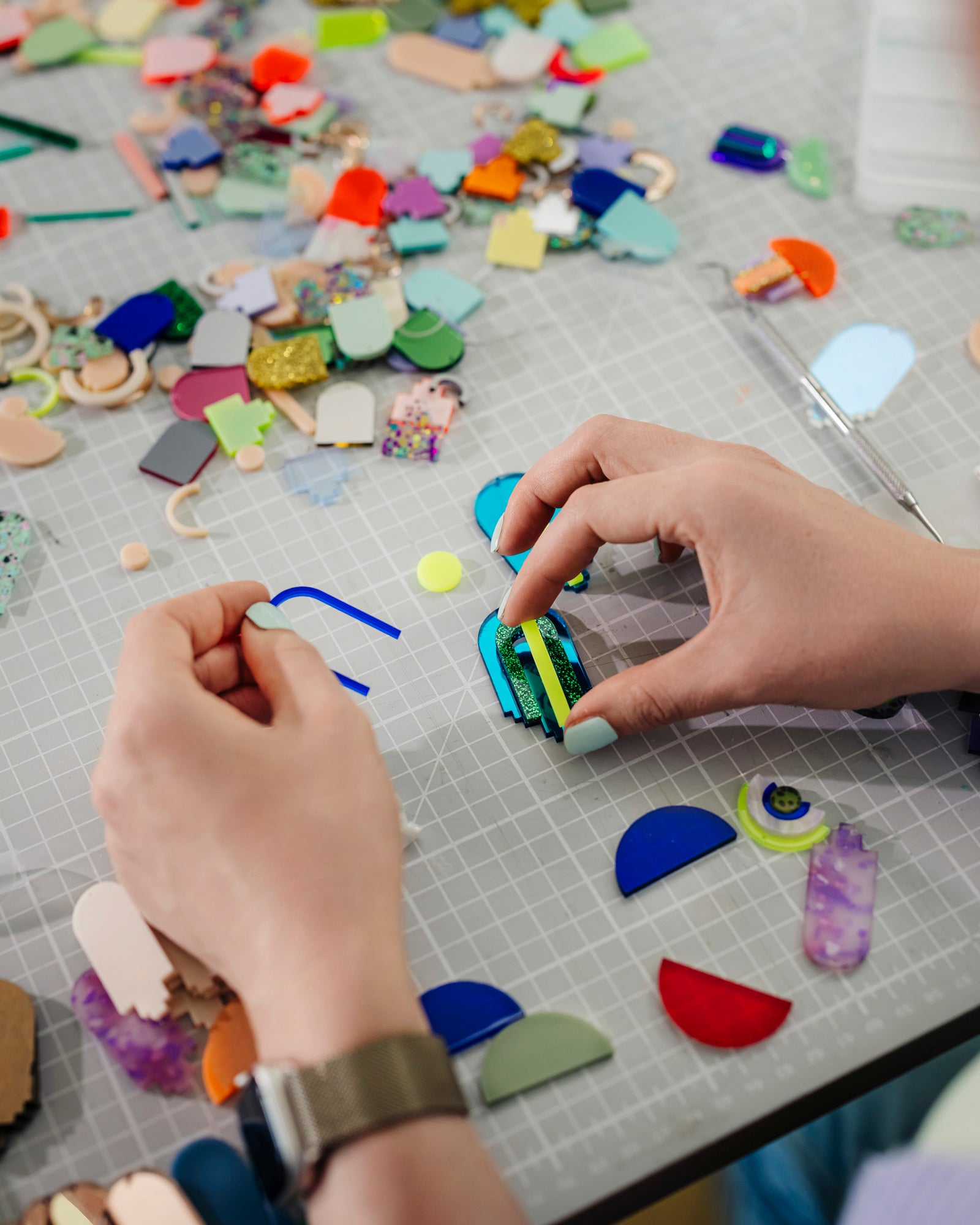 In meinem Atelier in Langenhagen gestaltest du in rund drei Stunden ein individuelles Ohrring-Set aus farbigem Acrylglas: ein Statement-Paar plus ein reduziertes Zweitpaar – zum Beispiel Kreolen oder Stecker. Die Acrylteile sind vorab präzise mit dem CO₂-Laser geschnitten, du kombinierst, arrangierst und finalisierst dein Design.